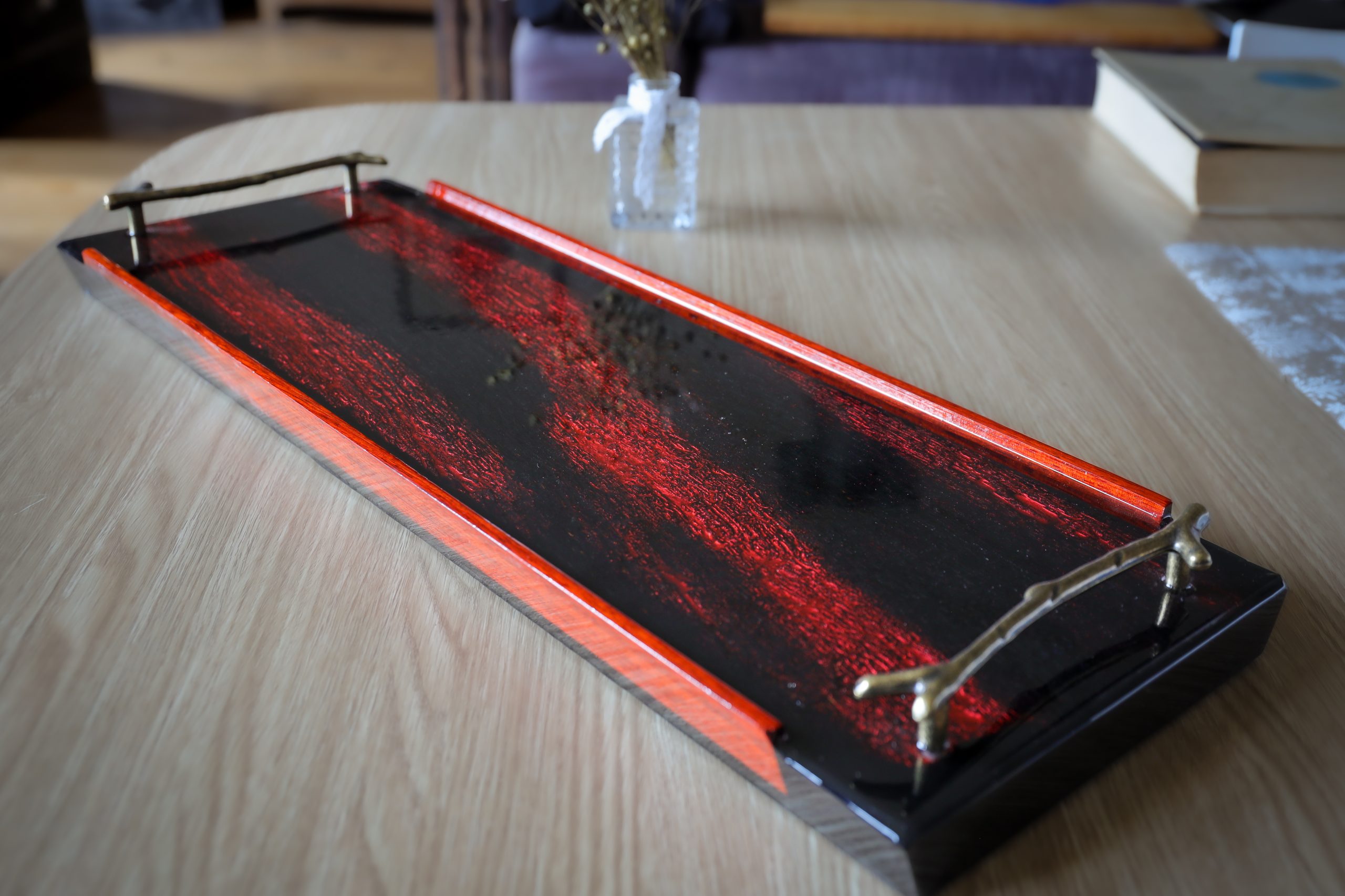 | 60x21x6cm(avec poignées) | Plateaux en Chêne brulé -Padouk – Résine époxy rouge et transparente – glaçage – Poignées métal couleur bronze |